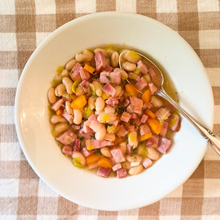 Add the chopped leeks, carrots, garlic, 1 teaspoon of salt and a few grindings of fresh pepper to the pit. Stir to combine and cook until the carrots and leeks have softened. Pour in the two tablespoons or white wine vinegar and stir, cook for 1 minute. Add the 8 cups of chicken stock and then the beans to the pot. Stir to combine everything. Bring to a simmer and allow to simmer for 20 minutes. Taste for seasoning and add more salt, pepper, or white wine vinegar as needed.